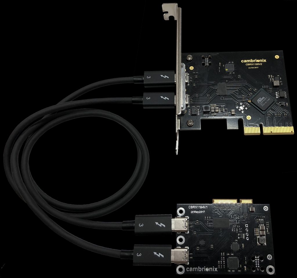 This is a 4 Lane PCIe Gen2 card designed by Cambrionix which is 1 slot wide. Power consumption is minimal. The 4 PCIe Gen2 lanes (5Gbps each) are split over the high-speed 20Gbps transmission line pairs within the standard Thunderbolt 3 Type-C cables. This ensures that data integrity is maintained between PCIe card and the PCB module.